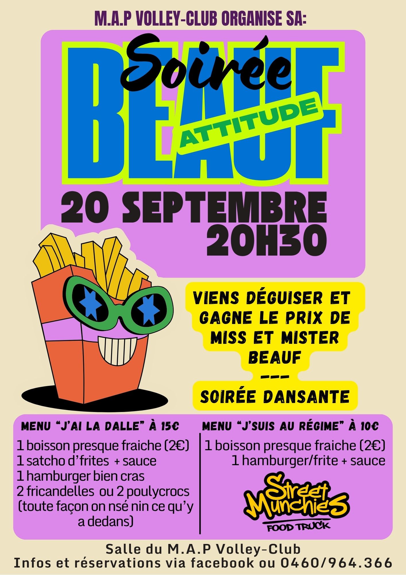 Comme l’an dernier, nous organisons un repas « sponsors » afin de remercier celles et ceux qui nous soutiennent. Cette année, place à la soirée "Beauf Attitude", en partenariat avec Street Munchies Food Truck le samedi 20 septembre ! Au programme : 🔸 18h30 : Match des P1 Messieurs face au RADS La Louvière → Présentation des joueurs et ambiance musicale pendant le match 🔸 Vers 20h30 : Repas – deux formules au choix : 🍔 Menu « J’ai la dalle » : 1 hamburger, 1 frite + sauce, 2 fricandelles ou 2 poulycrocs, + 1 boisson (à 2€) – 15 € 🥗 Menu « J’suis au régime » : 1 hamburger, 1 frite + sauce + 1 boisson (à 2€) – 10 € 🔸 Élection de Miss et Mister Beauf – On compte sur vous pour jouer le jeu et venir déguisés ! 🔸 Soirée dansante pour clôturer la soirée dans la bonne humeur 🎉 📍 La soirée se déroulera dans notre salle habituelle. Nous espérons vous voir nombreuses et nombreux afin de créer des liens en ce début de saison… Et bien sûr, continuer à faire vivre notre beau club ! 👉 Réservations attendues au plus tard le lundi 15 septembre. Les personnes extérieures au club sont bien entendu les bienvenues ! |
